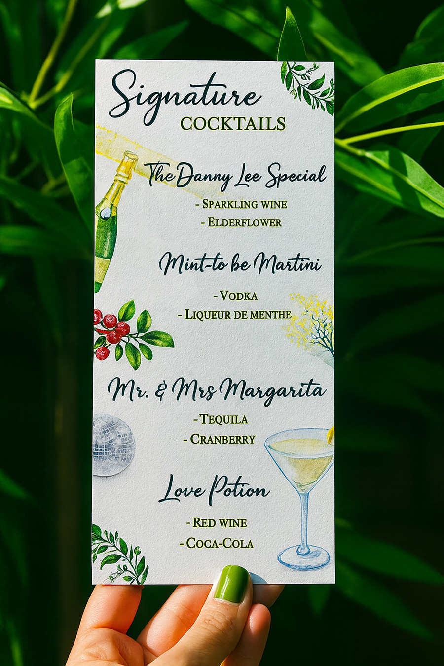 Our menus are created to harmonise with your décor, elevate your tablescape, and become keepsakes your guests will want to take home!
